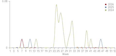 От началото на годината в страната е съобщен 1 случай. За същия период на предходната година не са съобщени случаи. Отклонението от предходната година е 1 .