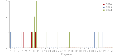 През 14 седмица на 2026 г. не са регистрирани случаи на епидемичен паротит. Отклонението от предходната седмица е (0).