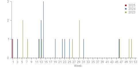 From the beginning of year the number of reported cases is 0. For the same period of the previous year the number of reported cases is 0. The deviation from the previous year is (0).