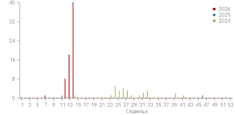 From the beginning of year the number of reported cases is 26. For the same period of the previous year the number of reported cases is 1. The deviation from the previous year is (25).