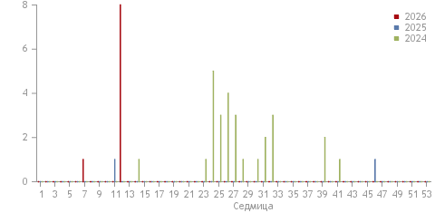 От началото на годината в страната е съобщен 1 случай. За същия период на предходната година е съобщен 1 случай. Отклонението от предходната година е 0 .
